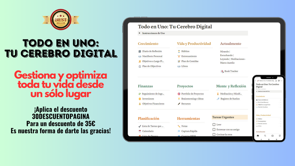 - Organización Total: No dejes nada al azar. Con Todo en Uno: Tu Cerebro Digital, tendrás todas las áreas de tu vida bajo control en un solo lugar.